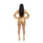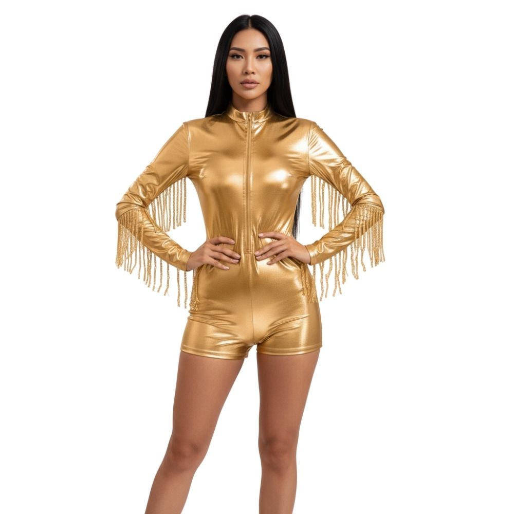 סרבל בוקרת קצר ומחטב עם פרנזים מטאליים שזזים איתך בכל צעד – מושלם לפורים, רייבים, קרנבלים, מסיבות פסטיבל, במה והפקות סטייל נוצצות.