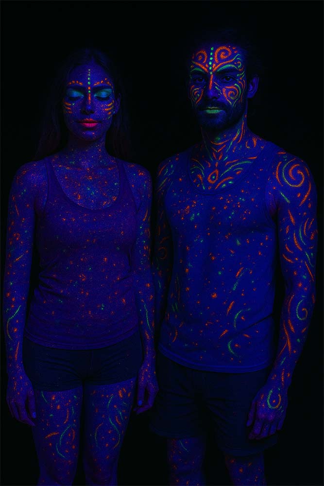• צבעים אולטרה־זוהרים – נראים רגיל באור יום וזוהרים באור אולטרה/UV!