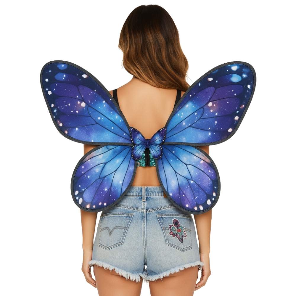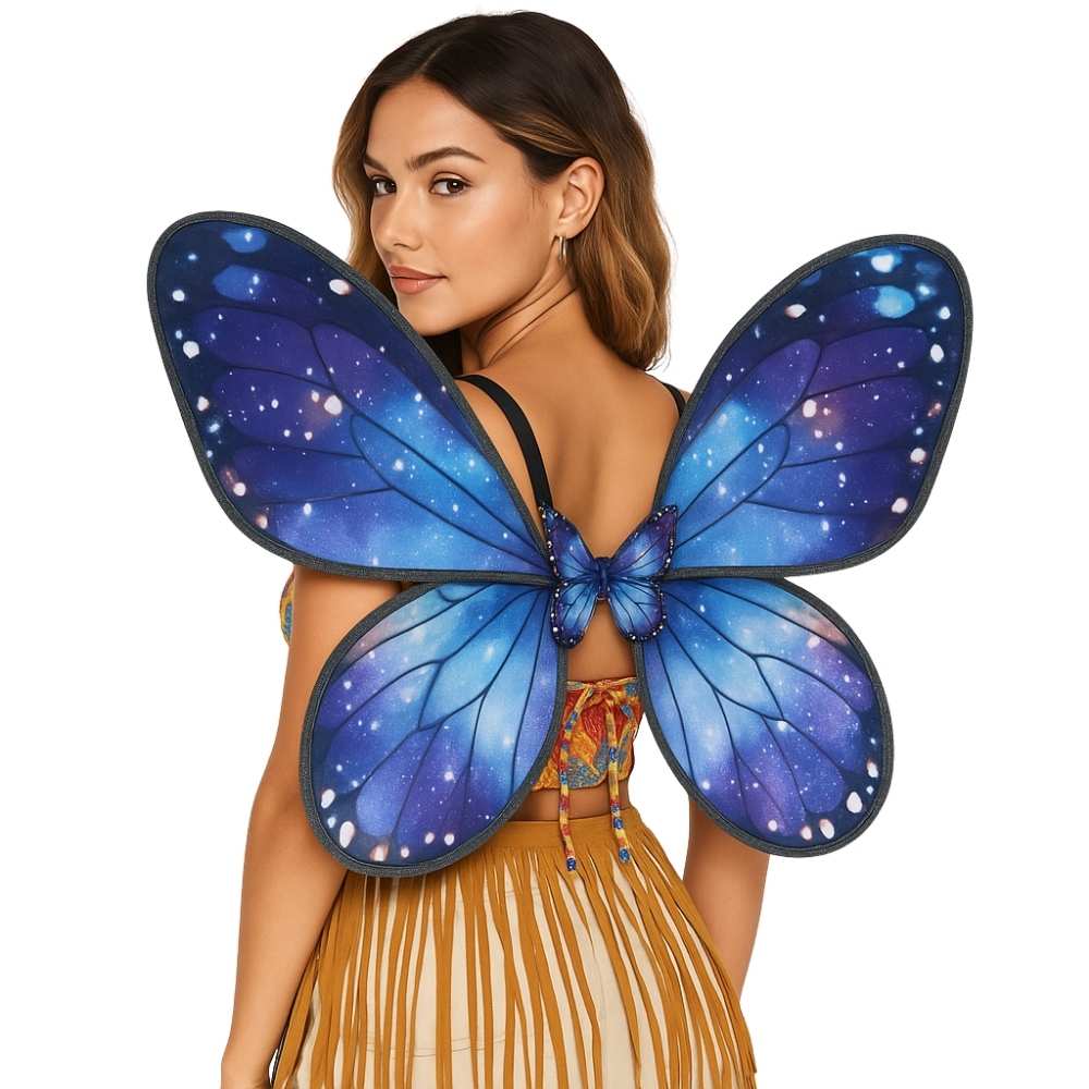 כנפיים קסומות בעיצוב ייחודי בגווני כחול־סגול עם הדפס גלקסיה מנצנץ, משלבות בין יופי, עוצמה ותחושת ריחוף מהפנטת.