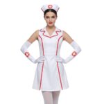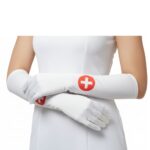 כפפות לבנות ואלגנטיות באורך מיוחד, עם סמל פלוס רפואי אדום שמעניק ללוק של האחות מראה מקצועי, נקי ומרשים.