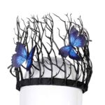 כתר מלכת האופל משלב ענפים שחורים דרמטיים עם פרפרים כחולים אלגנטיים, ליצירת מראה מסתורי ומרשים.