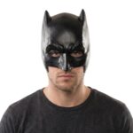 מסכת באטמן שחורה עם קווי מתאר חדים ואוזניים מחודדות, בהשראת הדמות המקורית, למראה דרמטי ומדויק.