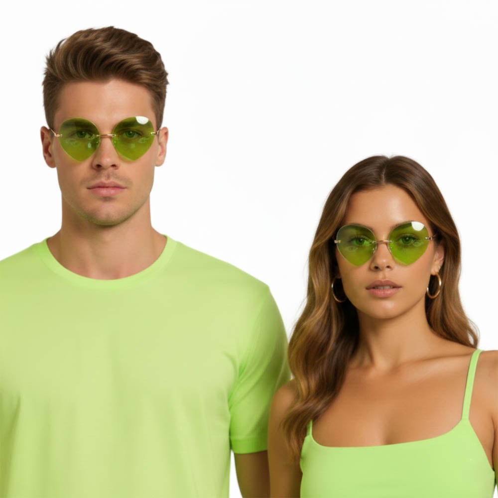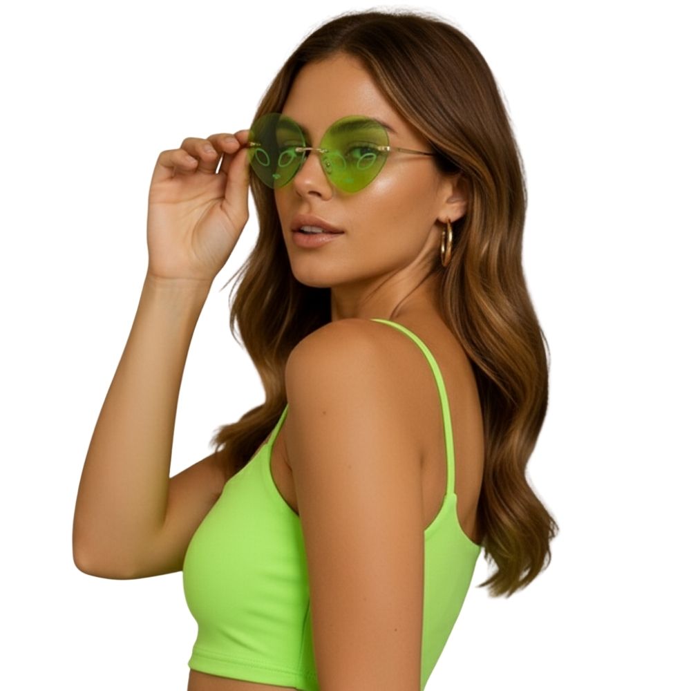השילוב בין המסגרת האלגנטית לעדשות השקופות־ניאוניות יוצר תחושה של סטייל חוץ־עולמי – מושלם לפורים, פסטיבלים, מסיבות, והפקות אופנה.
