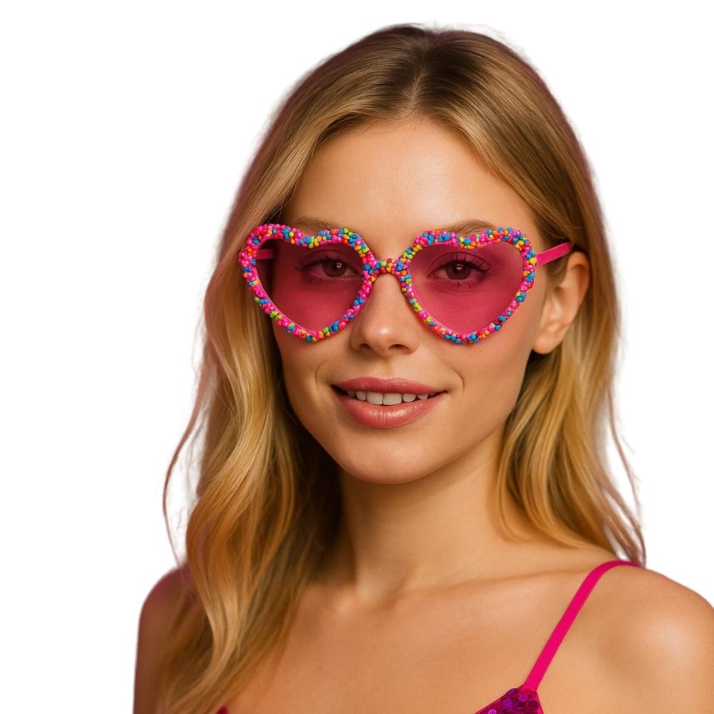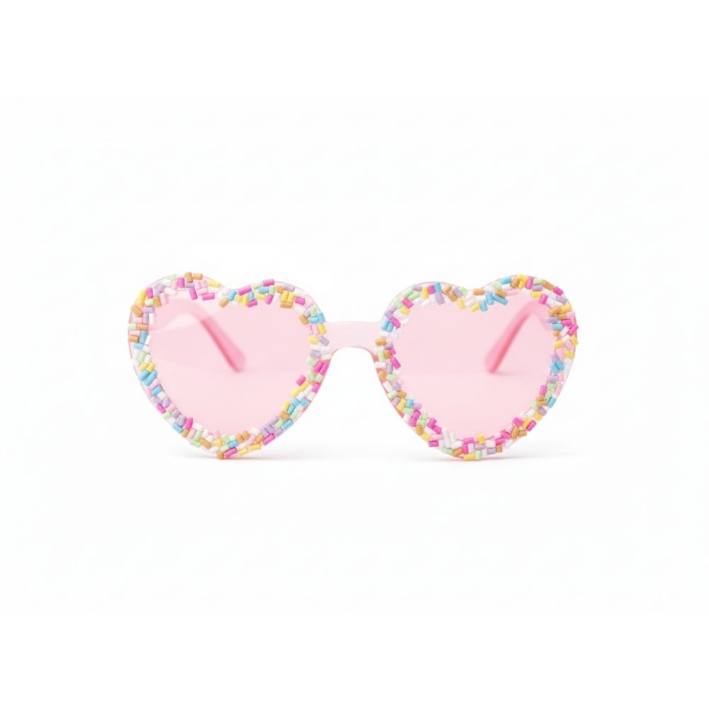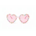 משקפי שמש בעיצוב לבבות ורודים, מעוטרות בגבולות צבעוניים המדמים סוכריות מתוקות – מושלמות לכל מי שאוהבת לבלוט, לחייך ולשדר אנרגיה שמחה ומרעננת.