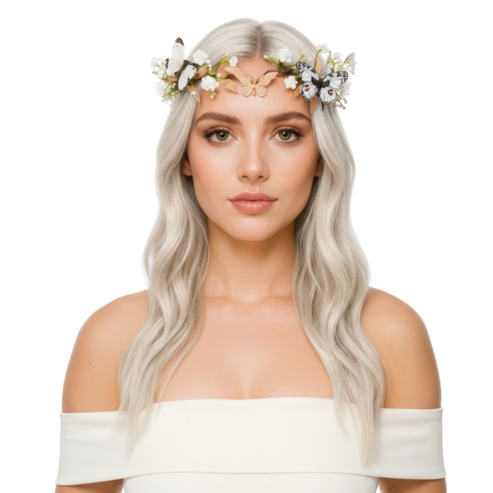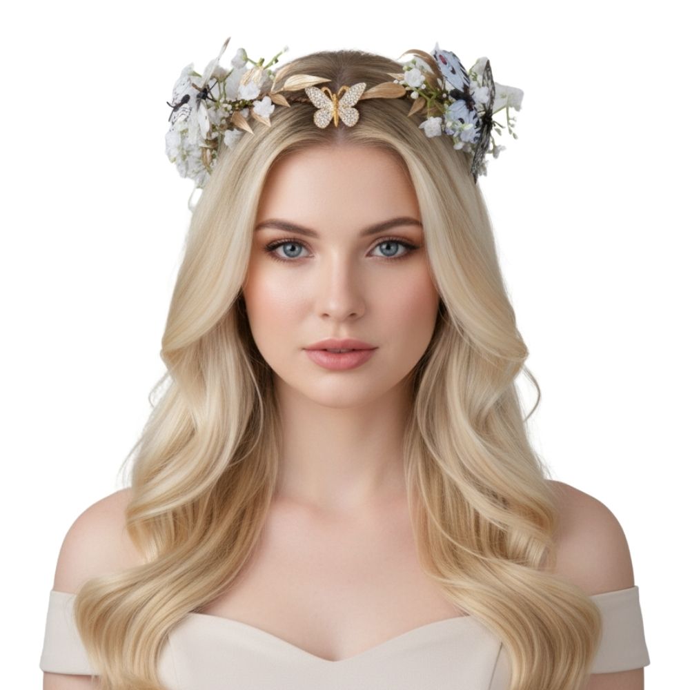שילוב של עלים לבנים וזהובים, פרחים לבנים רכים ופרפר זהב במרכז יוצר מראה נקי, קלאסי ורומנטי – מושלם לכלה, פיית שלג או מלכת טבע קסומה.