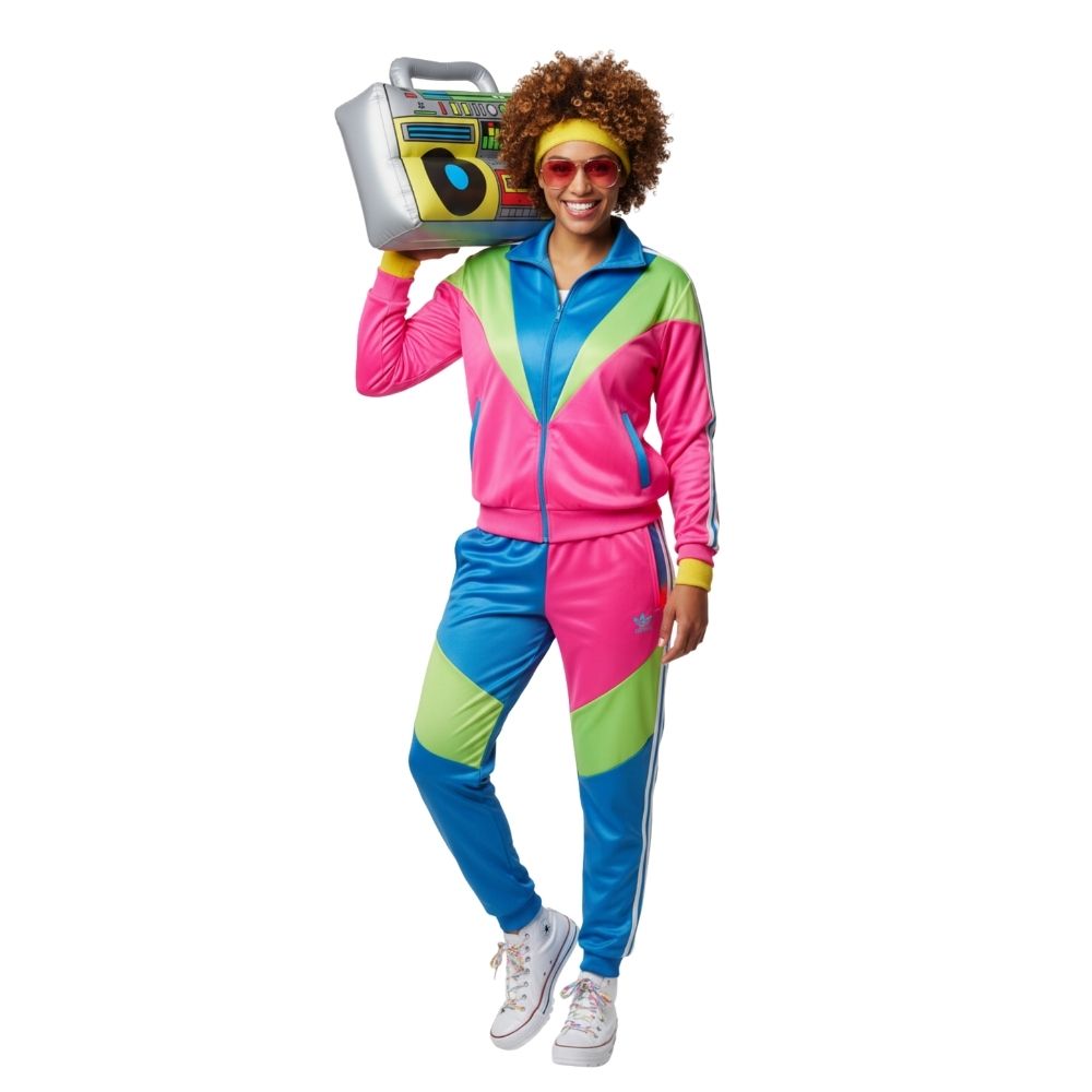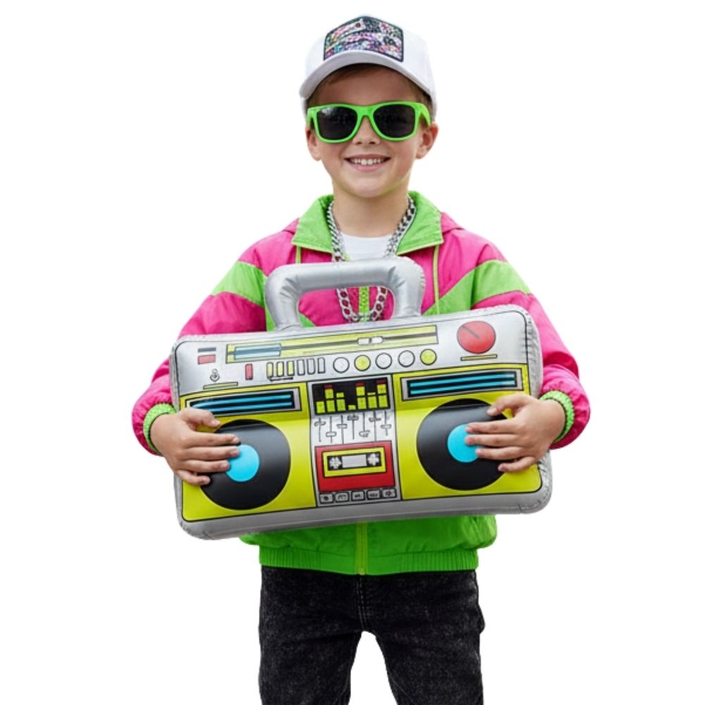 רדיו רטרו מתנפח בעיצוב צבעוני ושמח, מושלם להשלמת תחפושות שנות ה-80 ולכל מי שרוצה להוסיף טאץ' כיפי ומלא חיים למראה שלו.