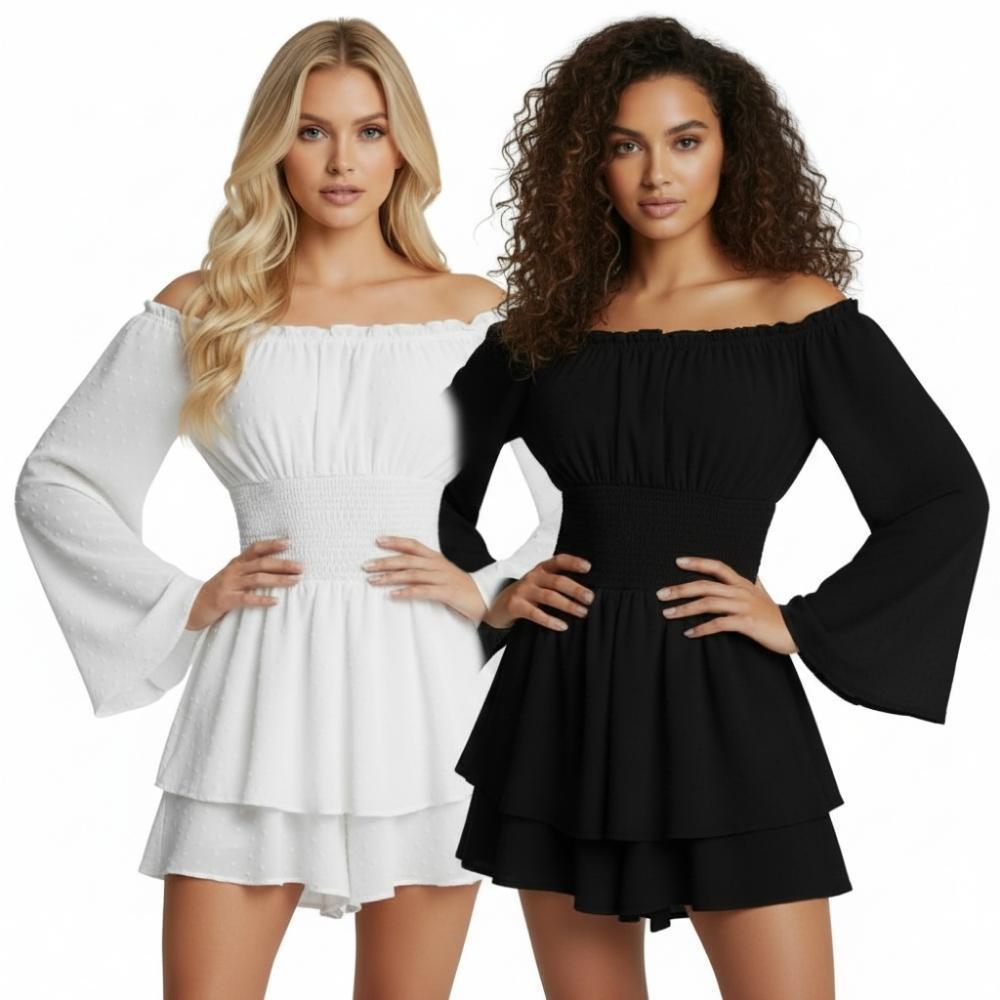 🌿 שמלת מיני סטרפלס מעוצבת – לבן / שחור