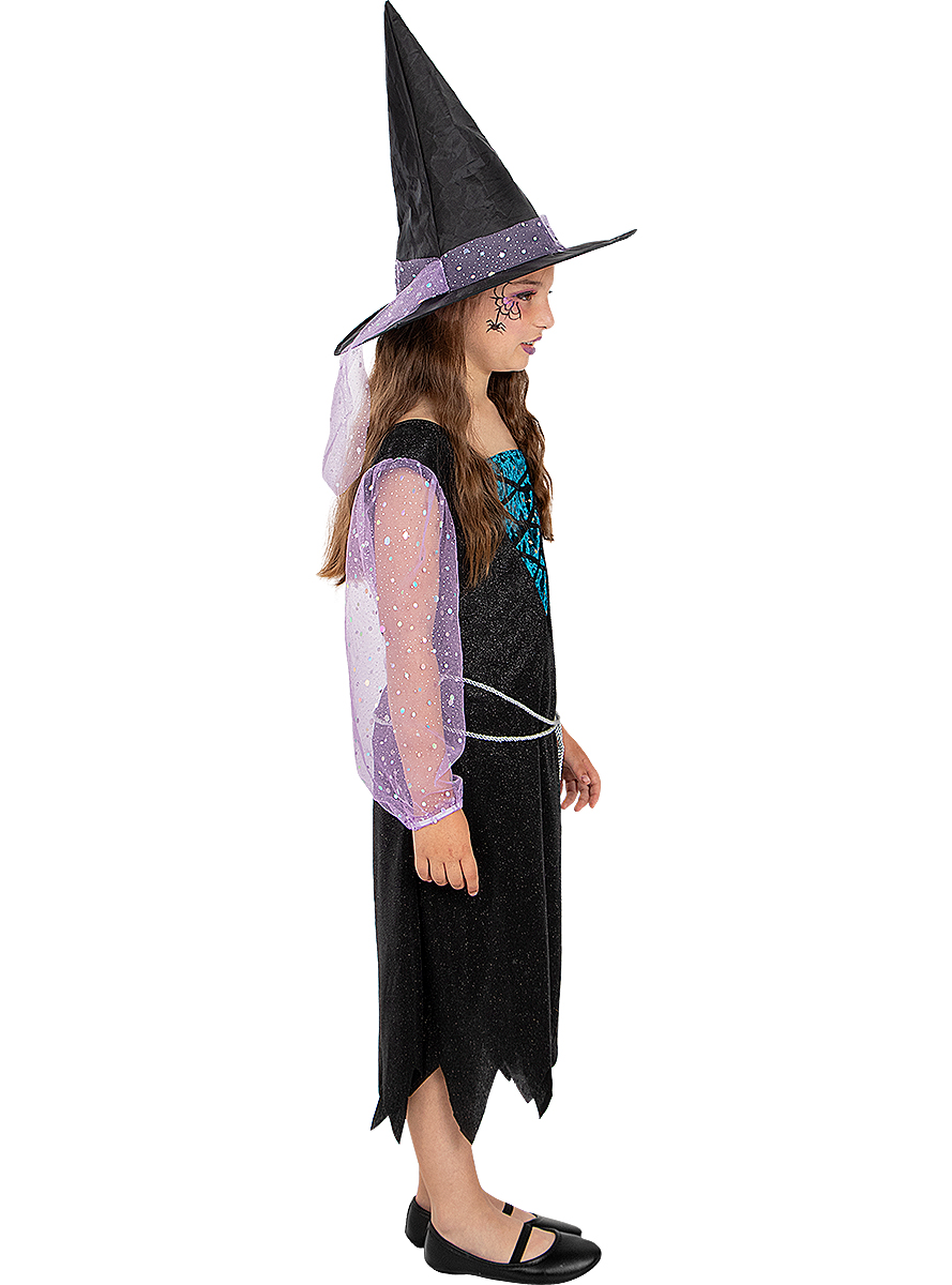 התחפושת כוללת שמלה ארוכה ומסוגננת עם כובע מכשפה מחודד להשלמת המראה המכשף.