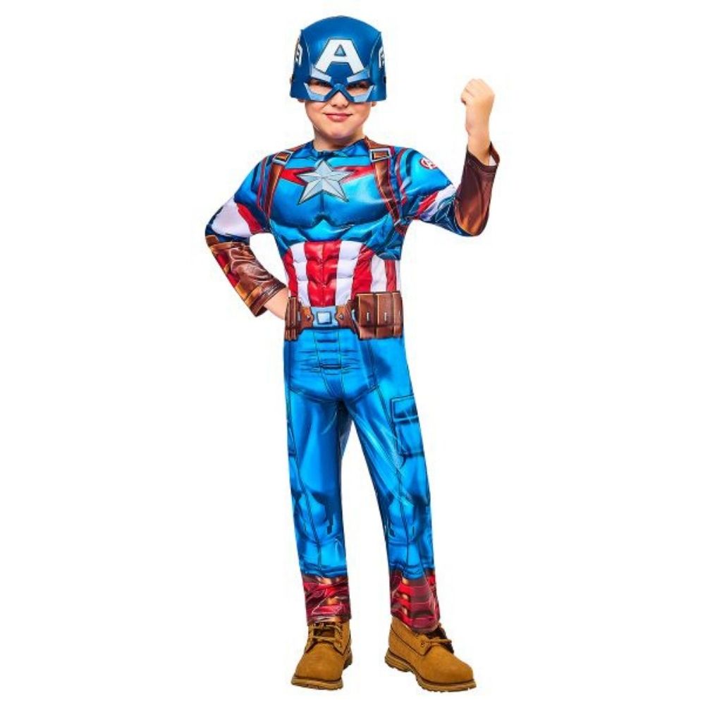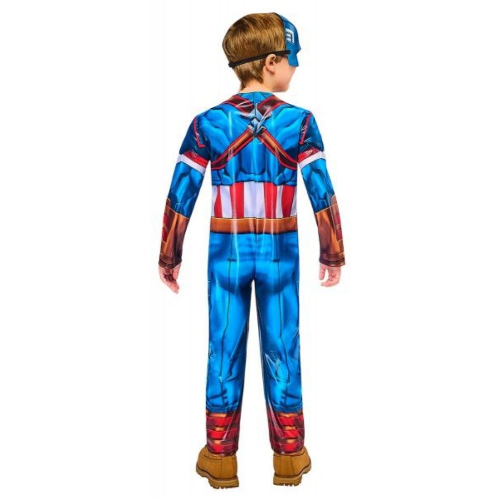 אוברול צבעוני עם הדפס שרירים וסמל הכוכב האייקוני, יחד עם מסכת קפטן אמריקה תואמת, יוצרים לוק גיבור אמיתי שכל ילד אוהב.