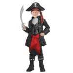 שילוב של מעיל שחור ארוך, וסט, חגורת מותן אדומה וכובע פיראטים עם סמל הגולגולת יוצר מראה אמיץ, הרפתקני ואייקוני שכל ילד אוהב.