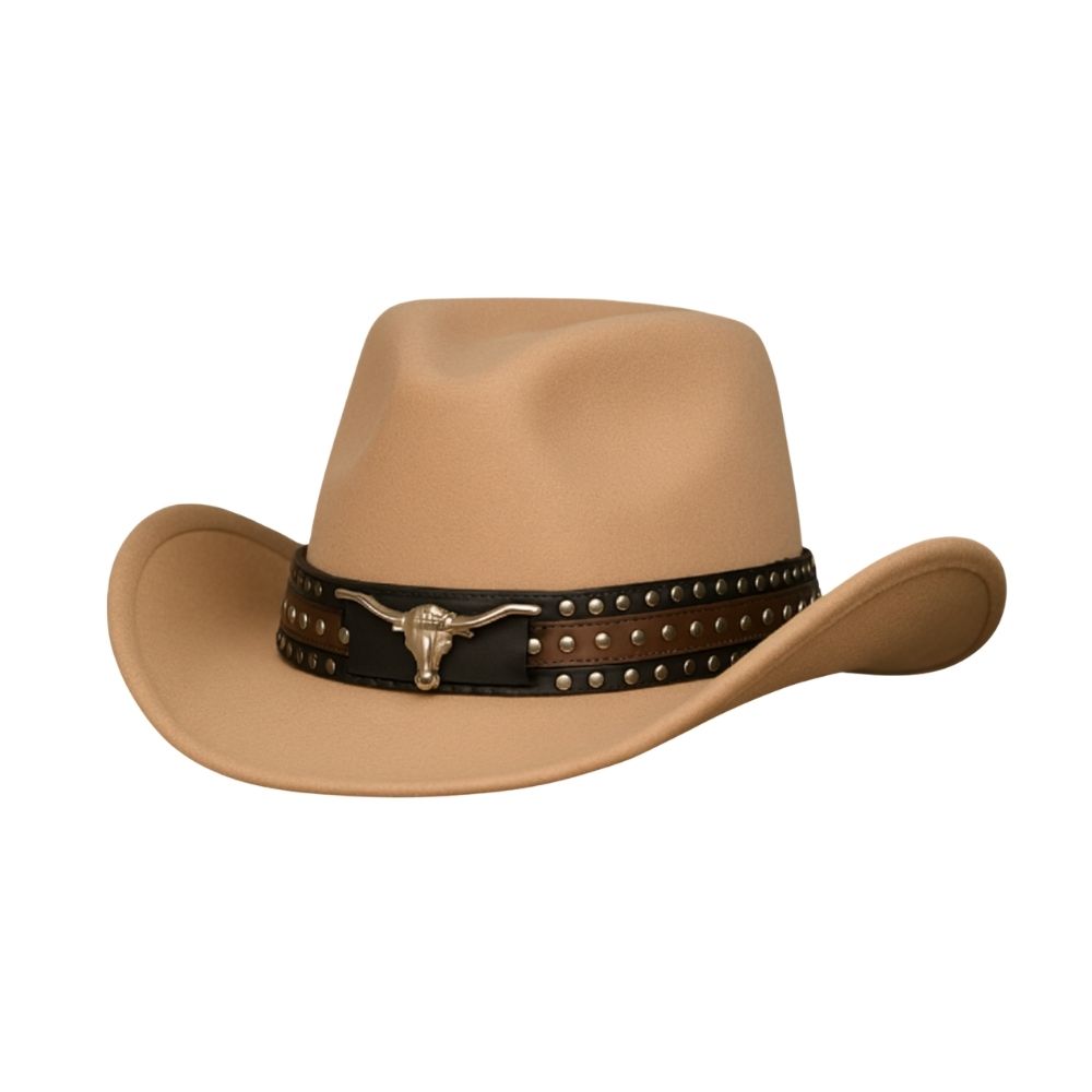 - 💀 גולגולת שור Longhorn: אלמנט מתכת מרכזי המעגן את הכובע בסגנון המערב הפרוע.