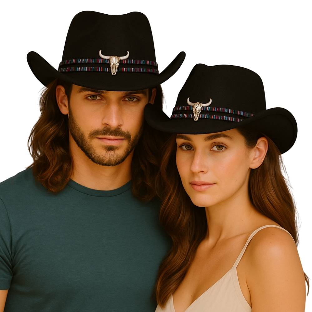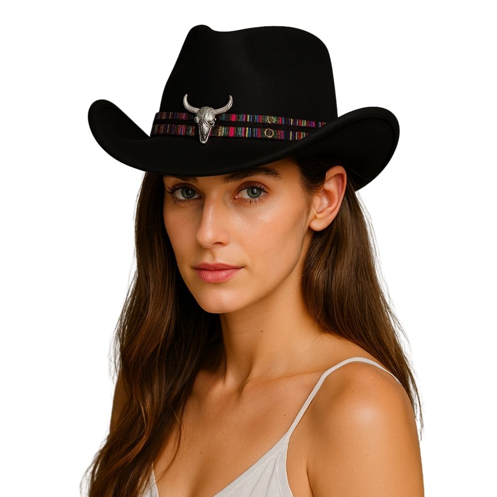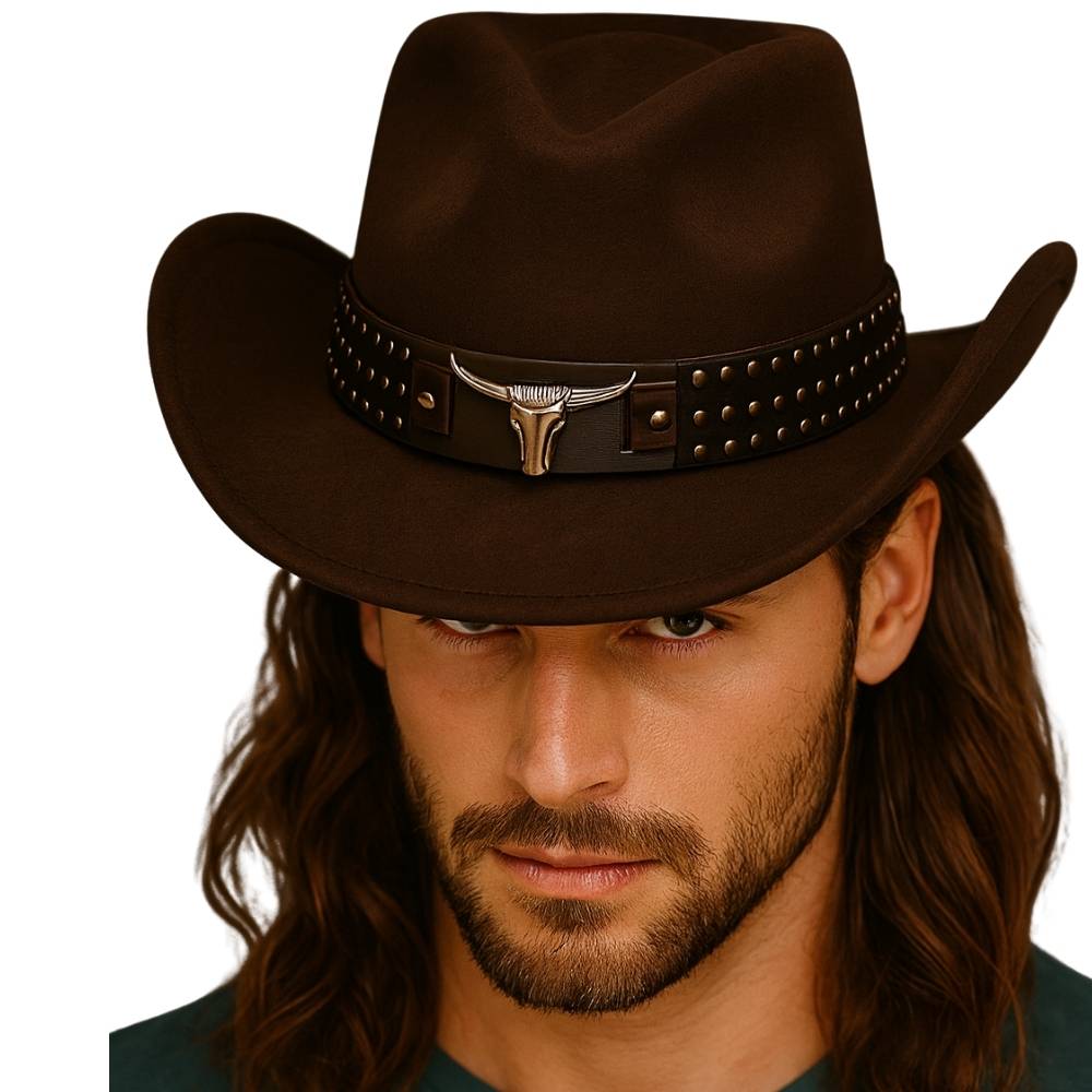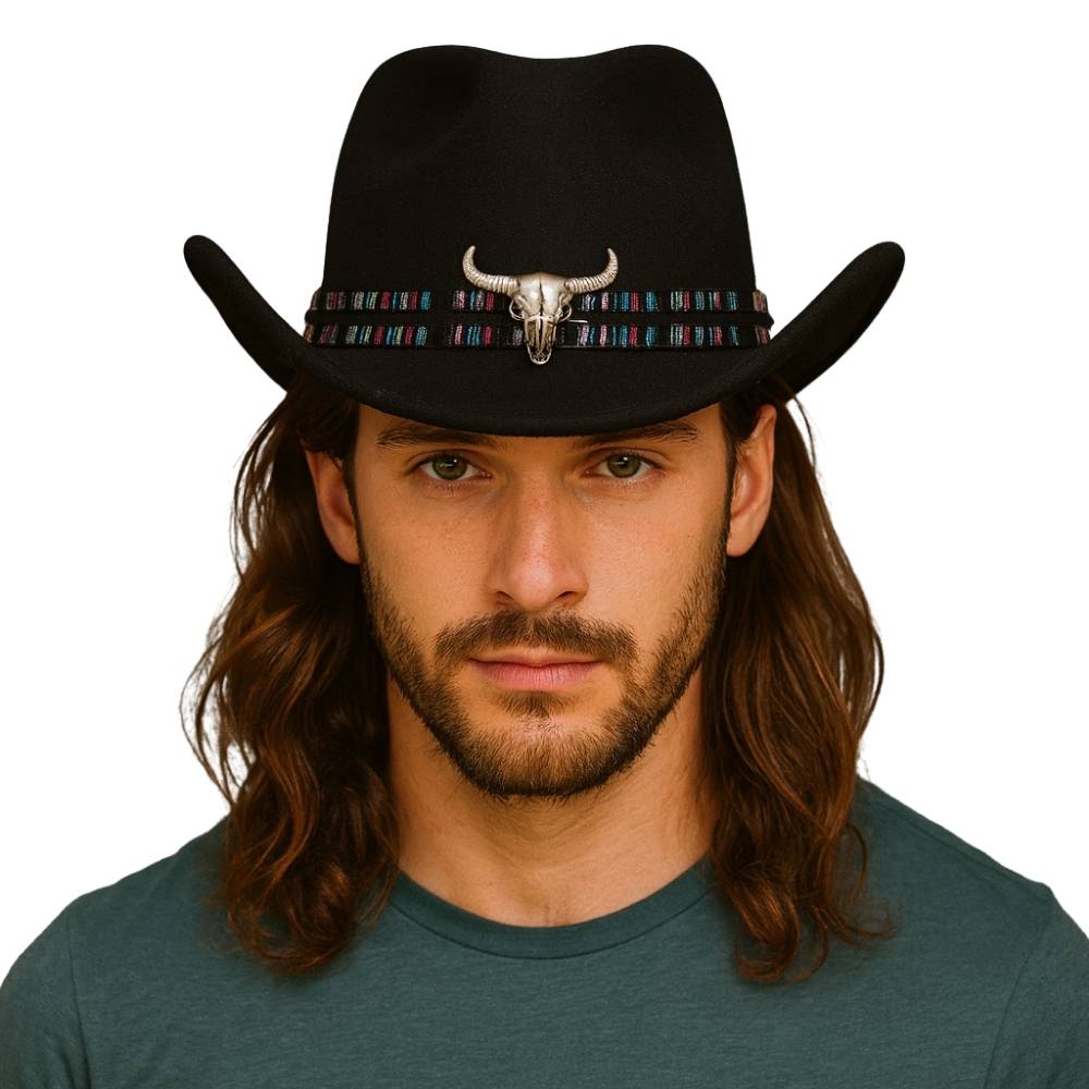 🎩 כובע קאובוי לבד יוקרתי – עיטור שבטי, גולגולת שור וגימור Longhorn