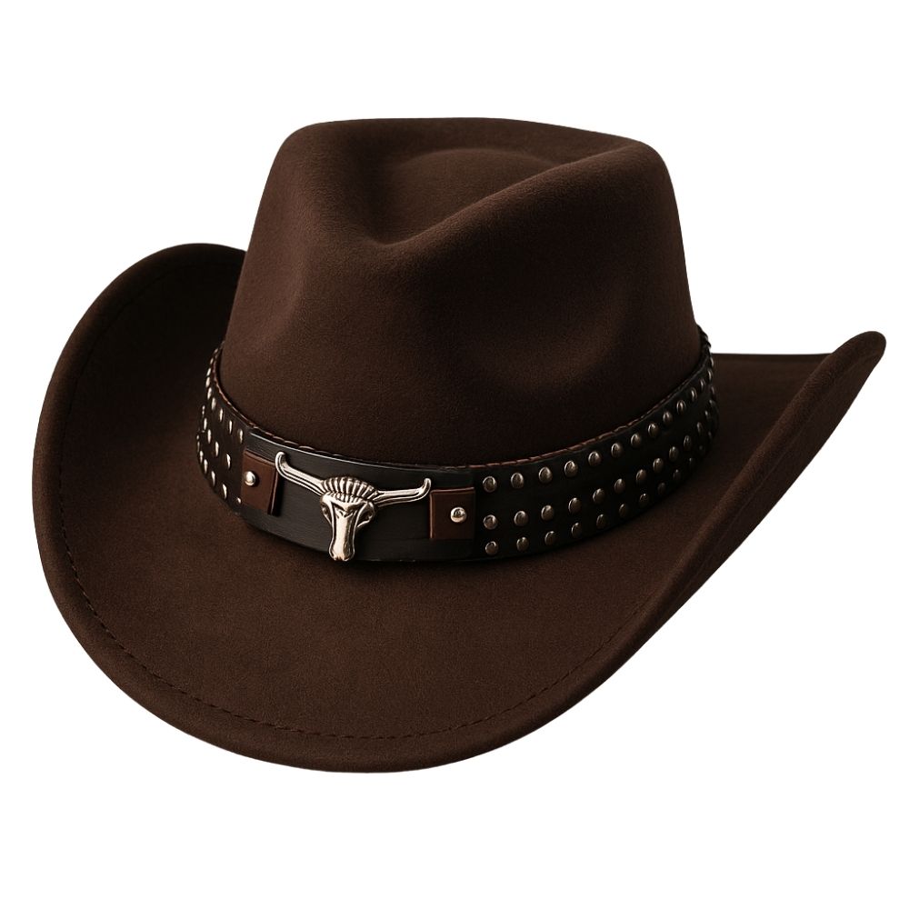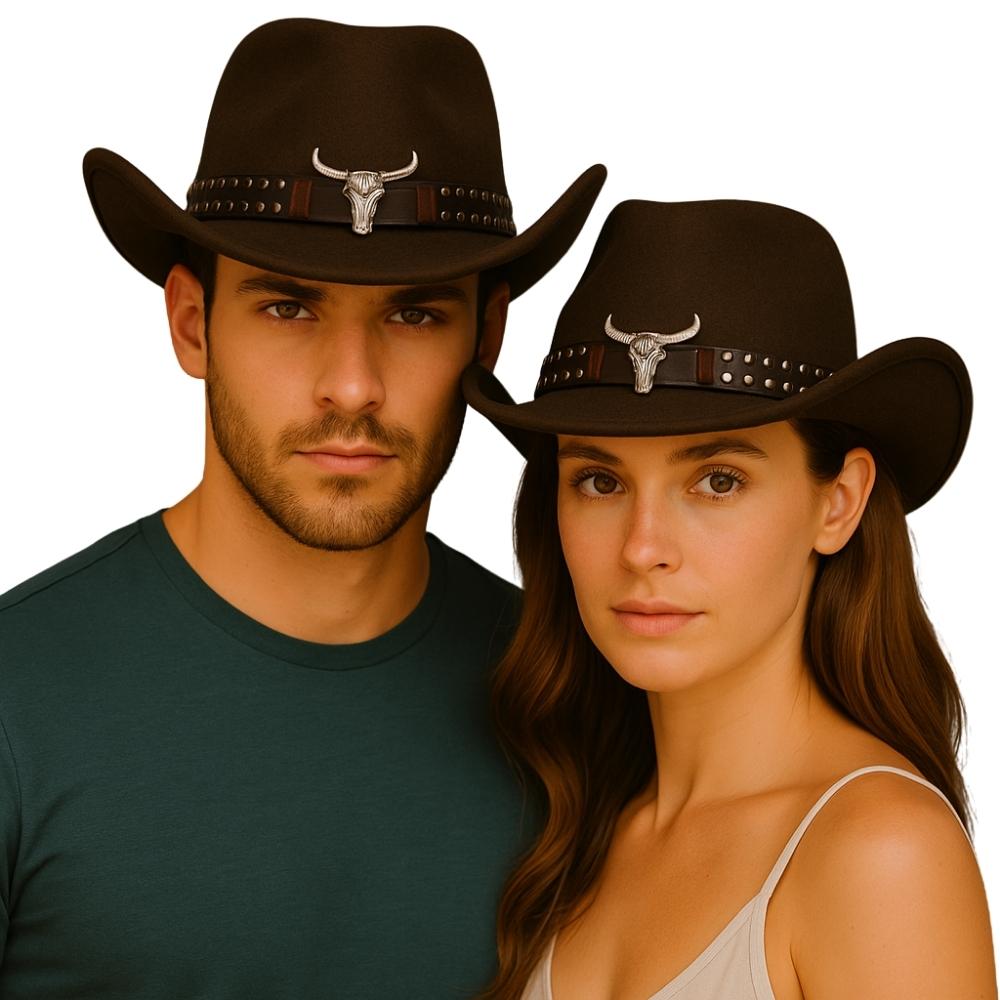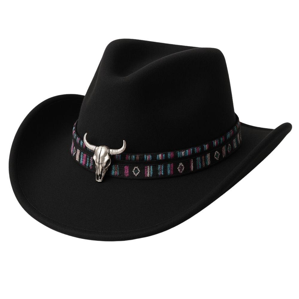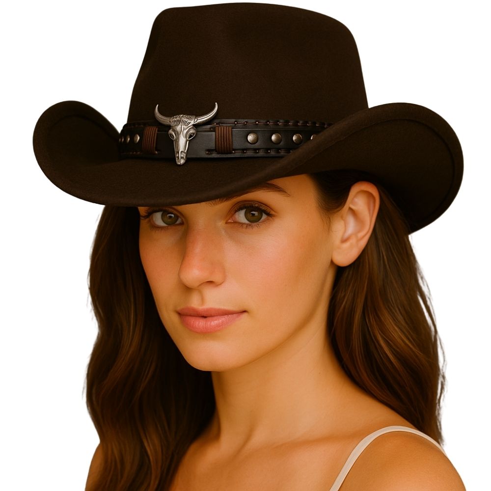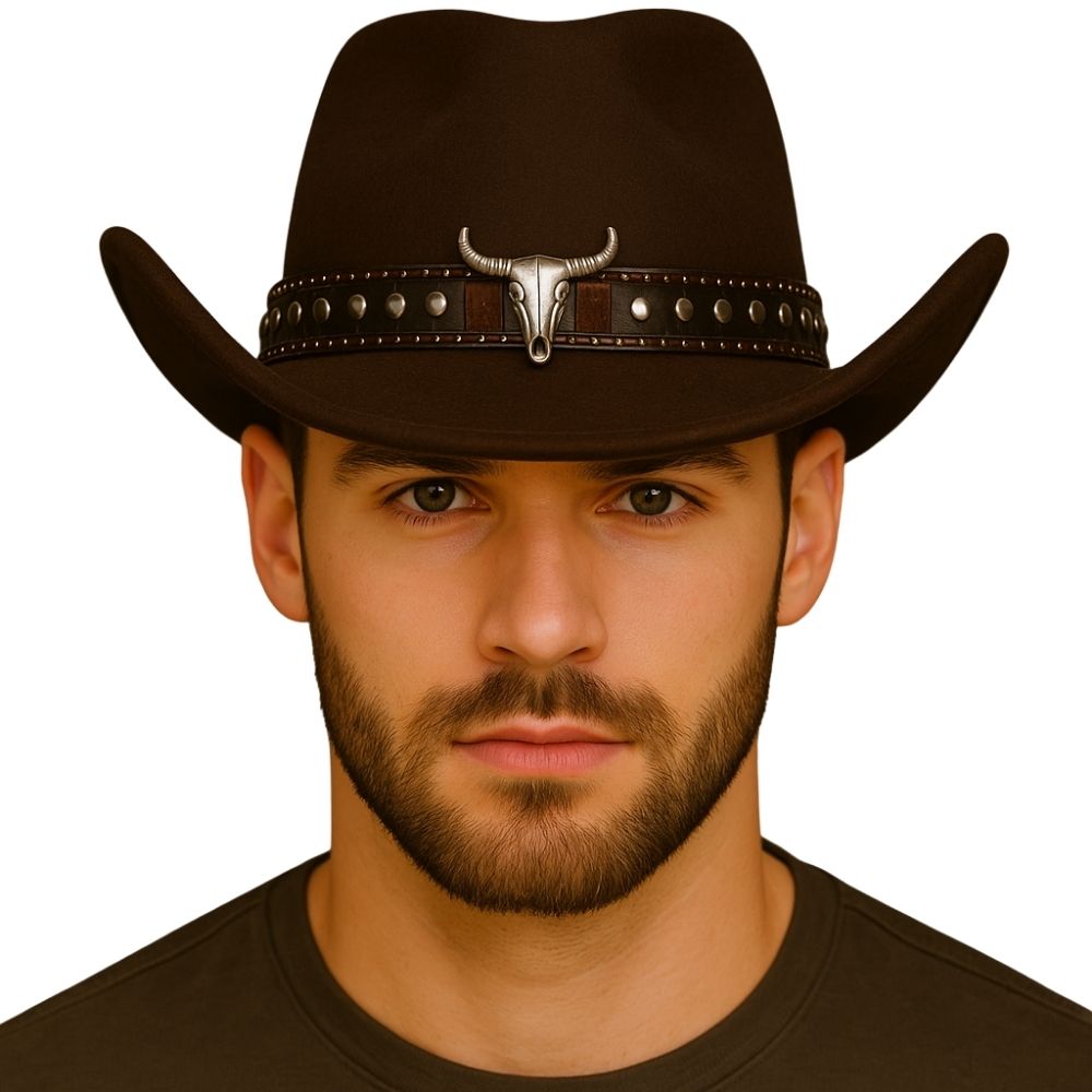 🎩 כובע קאובוי לבד יוקרתי – עיטור שבטי, גולגולת שור וגימור Longhorn