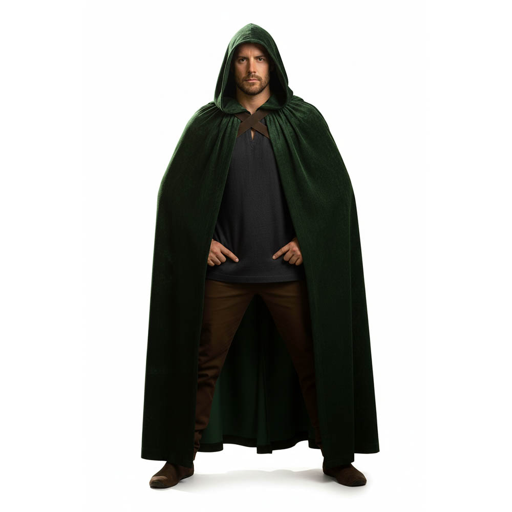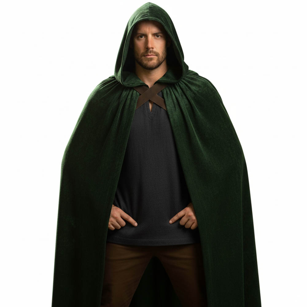 העצמת דמויות (Character Focus): הכובע (ברדס) העמוק והמבנה הרחב של הגלימה (150 ס"מ) מדגישים את הסתירה והמסתורין. זוהי גלימה מושלמת לדמויות של מתנקש, מגלה עתידות, דרואיד או אציל מסתורי מאשר לוחם יער חשוף.